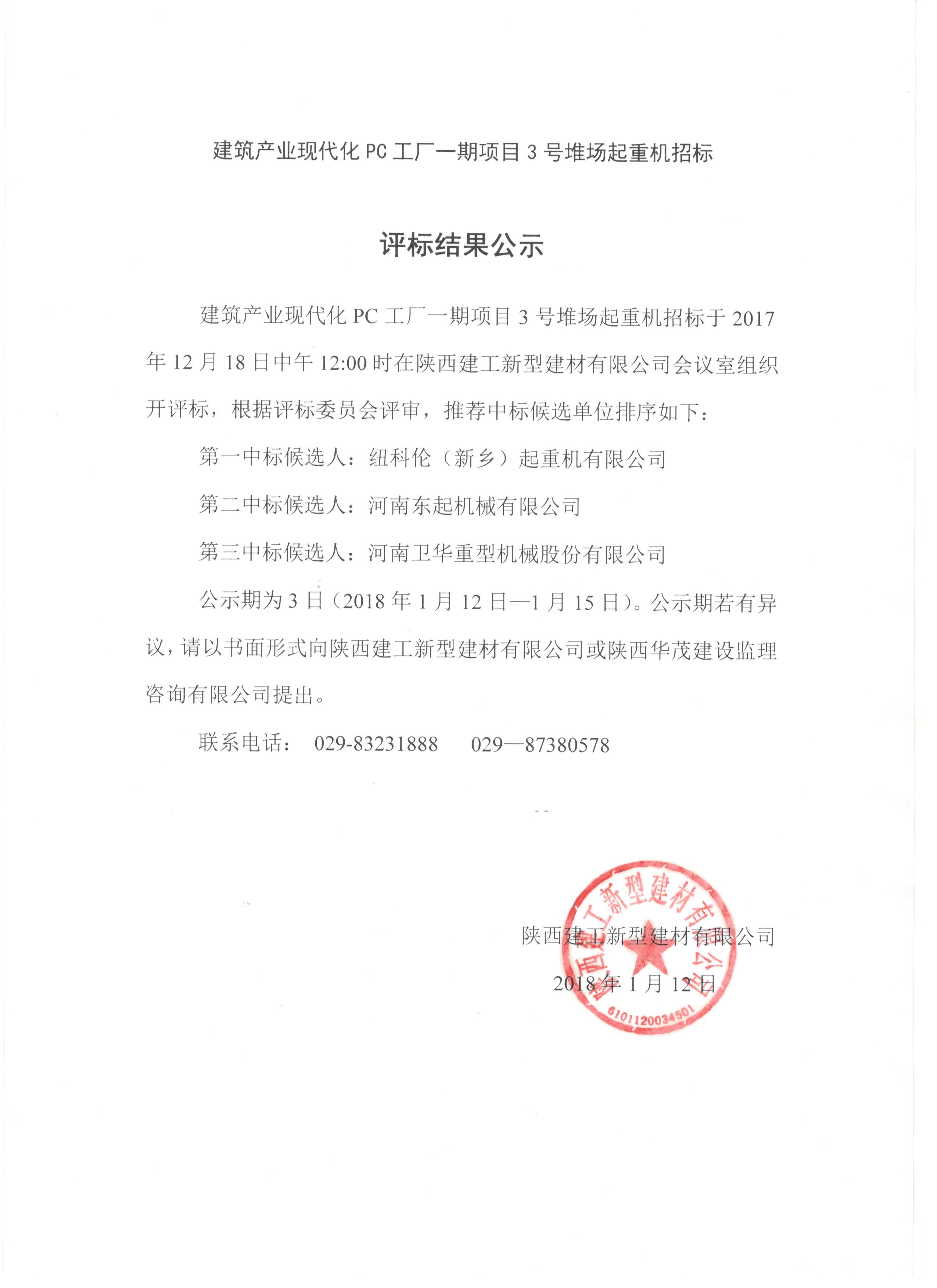 | 建筑產(chǎn)業(yè)現(xiàn)代化PC工廠一期項(xiàng)目3號(hào)堆場(chǎng)起重機(jī)招標(biāo)評(píng)標(biāo)結(jié)果公示 |
