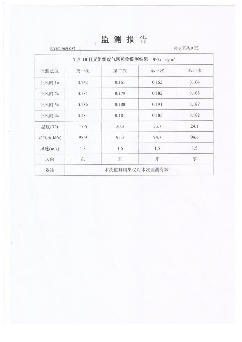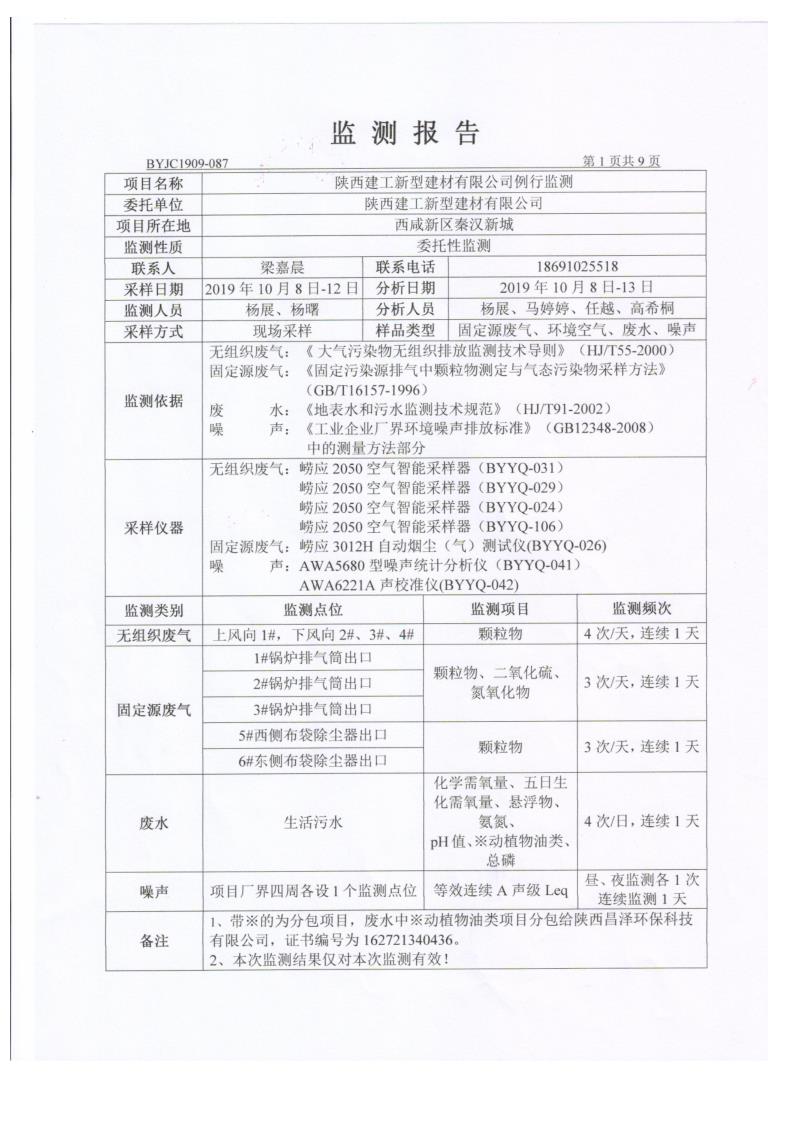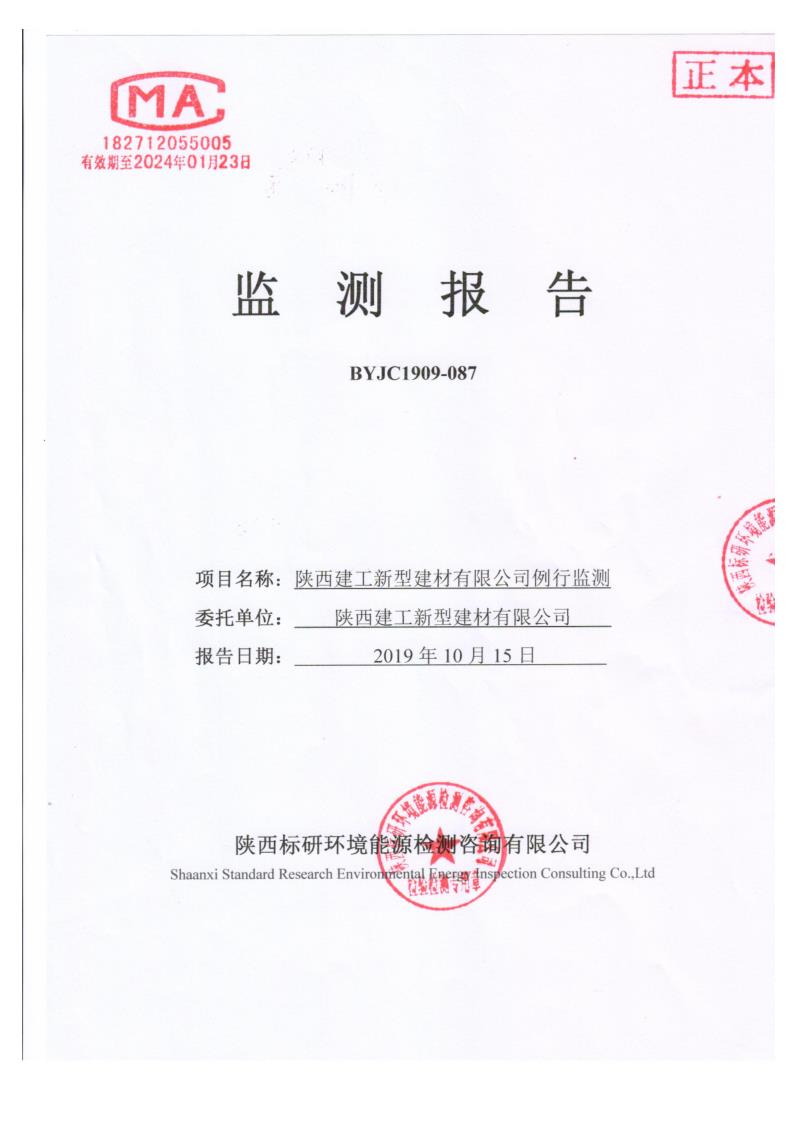 根據(jù)國家環(huán)保相關(guān)法律法規(guī)規(guī)定,陜建新型建材公司委托陜西標(biāo)研環(huán)境能源檢測咨詢有限公司進行了2019年環(huán)境檢測,現(xiàn)將公司2019年環(huán)境檢測報告(編號BYJC1909-087)進行公開。