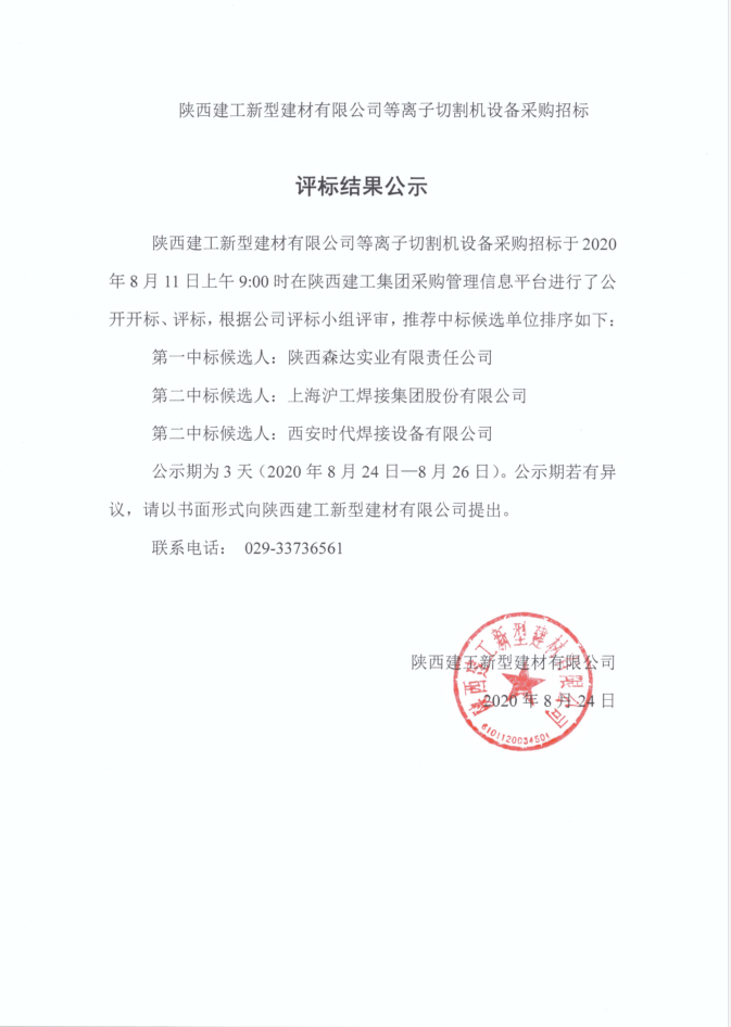 | 陜西建工新型建材有限公司等離子切割機設備采購招標 |