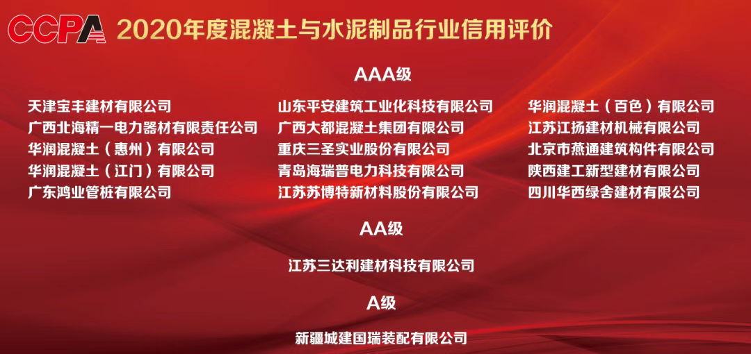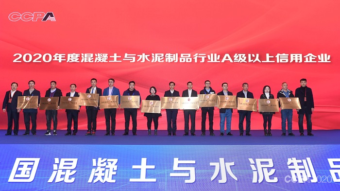 12月5日,2020中國混凝土與水泥制品行業(yè)大會在南京隆重召開,大會主題為“百年之大變局下的行業(yè)發(fā)展 準確識變 科學(xué)應(yīng)變 篤定創(chuàng)新”。在大會的授牌儀式上我司被授予2020年度混凝土與水泥制品行業(yè)企業(yè)信用評價AAA級信用企業(yè)。