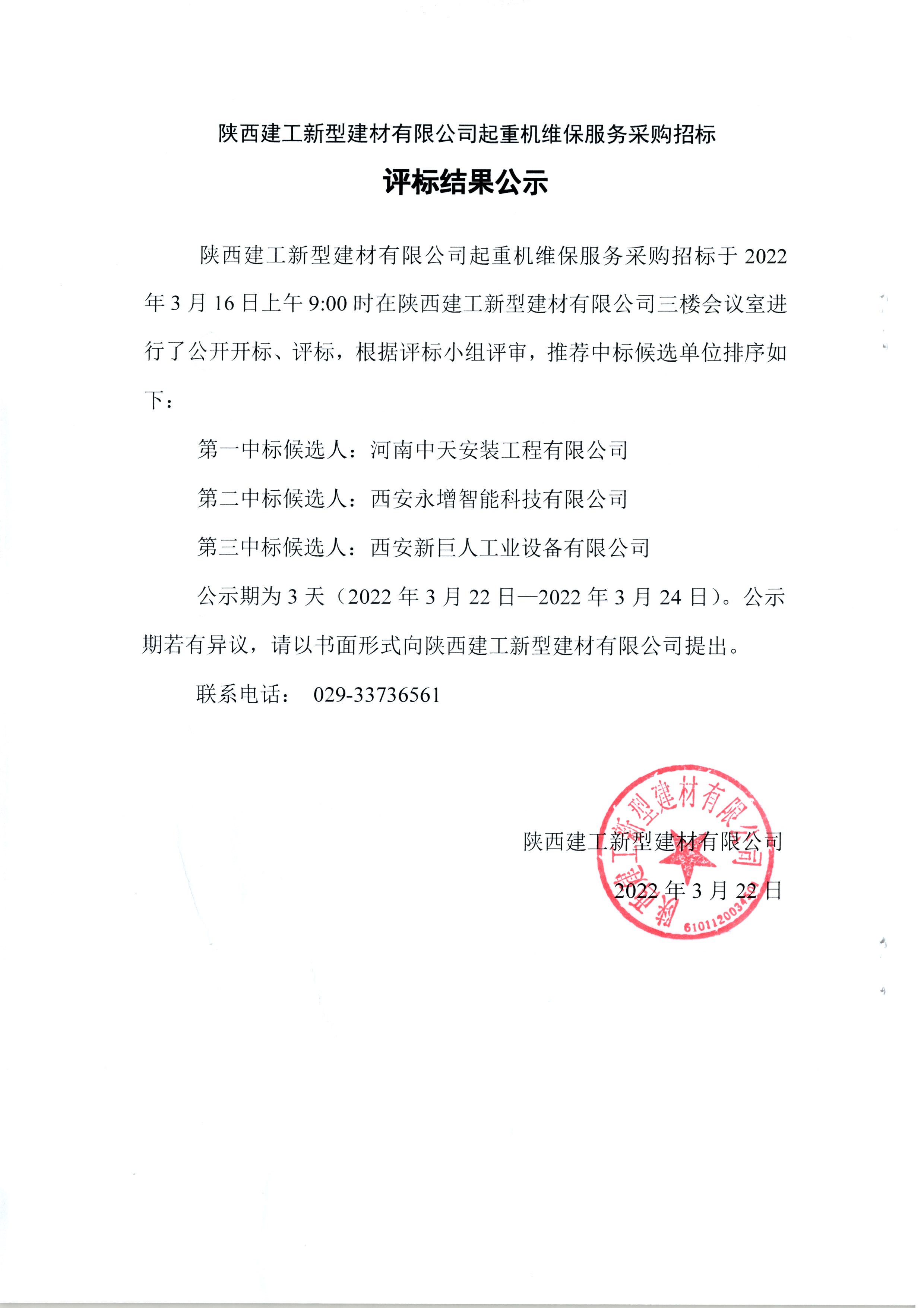 | 陜西建工新型建材有限公司起重機維保服務采購招標結果公示 |
