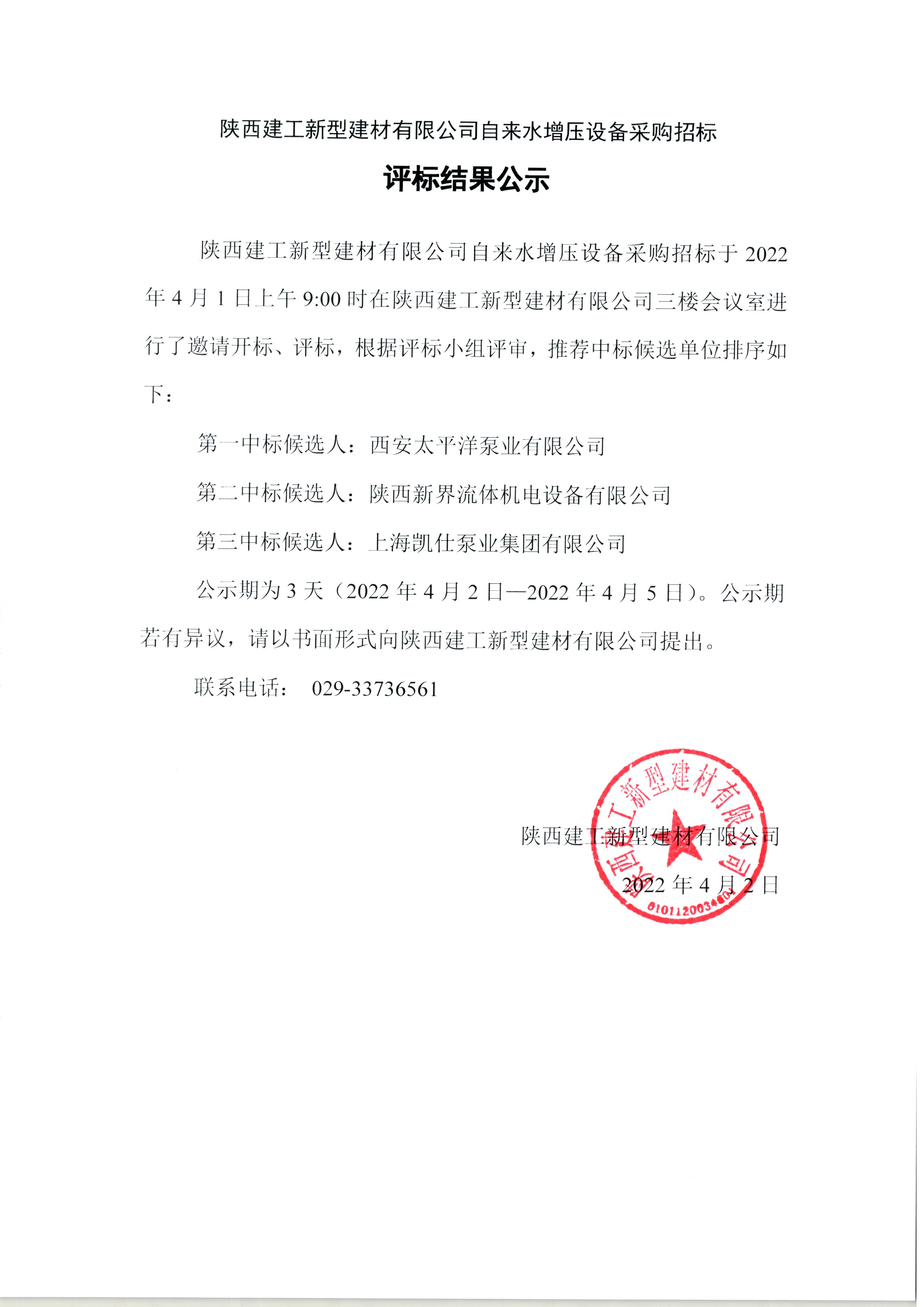 | 陜西建工新型建材有限公司自來水增壓設(shè)備采購招標結(jié)果公示 |